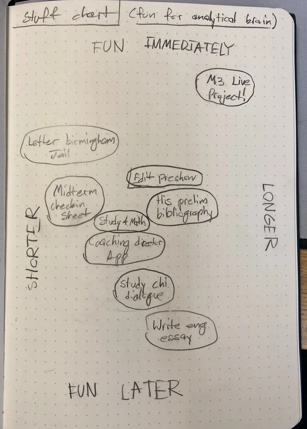 This is a cool one I recently thought of - It’s a “fun” chart that will let me figure out what work will be hardest to finish. The stuff that is “fun later” (or not really that fun) and long is much harder to do, while the short fun things I should save for when I lose motivation.