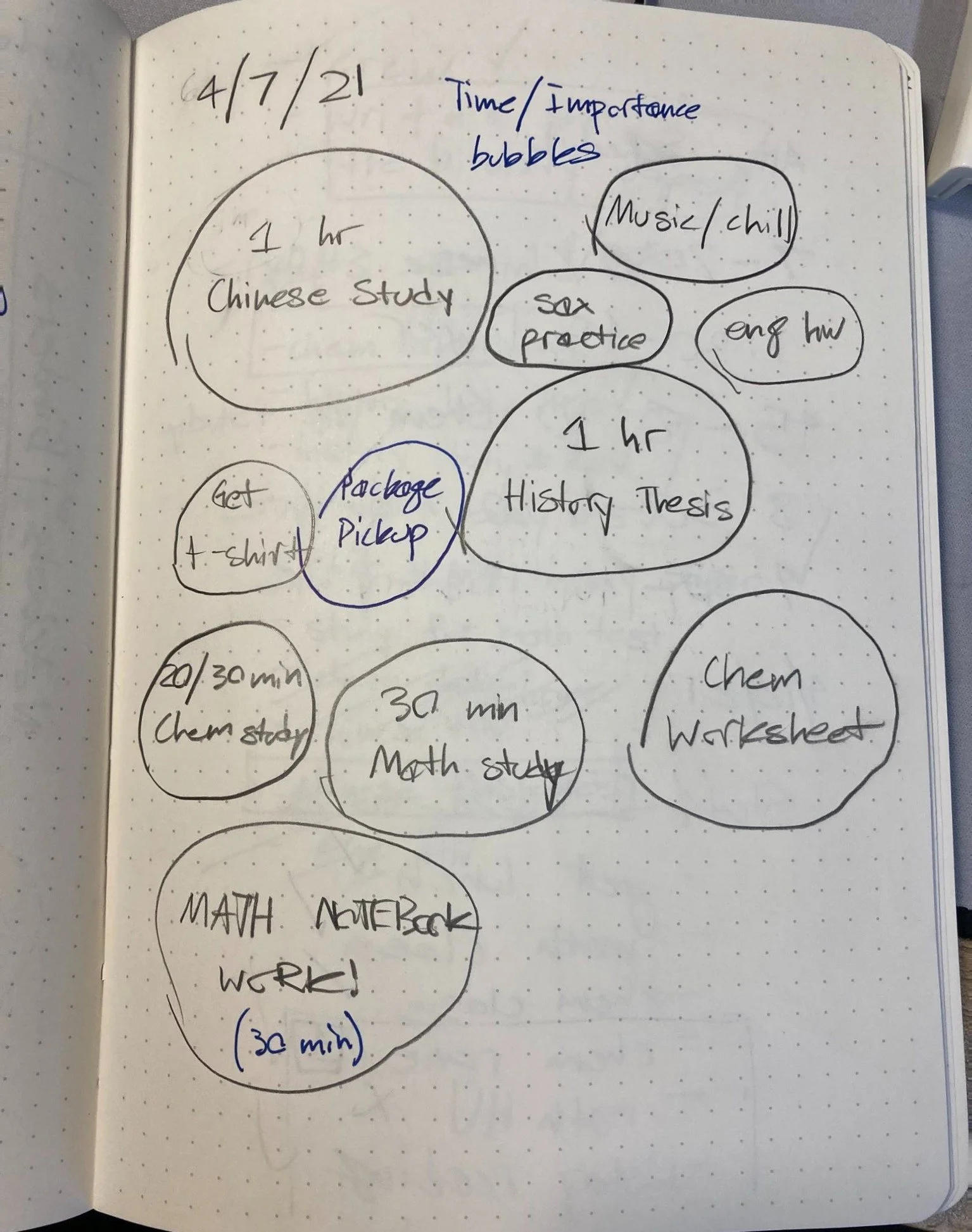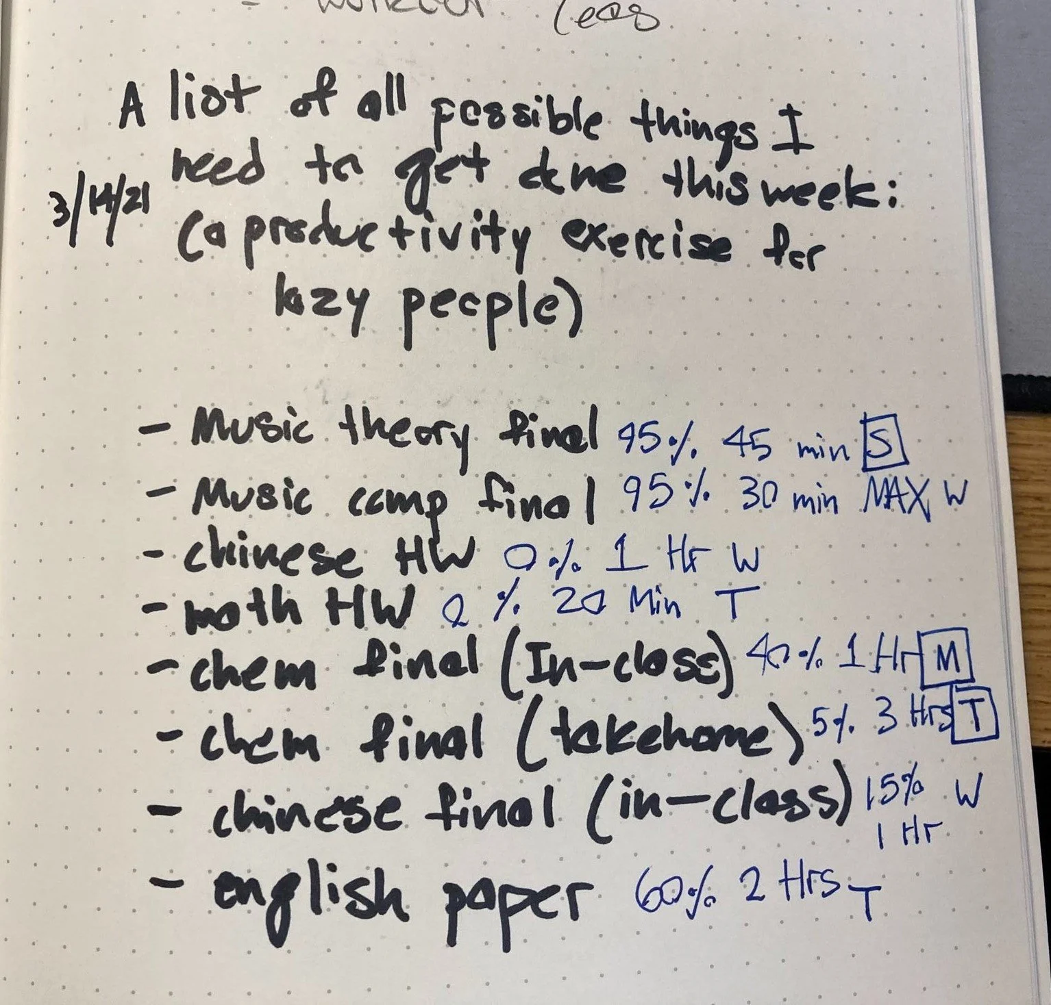 As stated in the title, this was my productivity exercise for lazy people. It was basically a list of things to finish, but I put how much I had already done (the percentage), the expected time to finish, and what day it was due on the right which makes this especially remarkable.