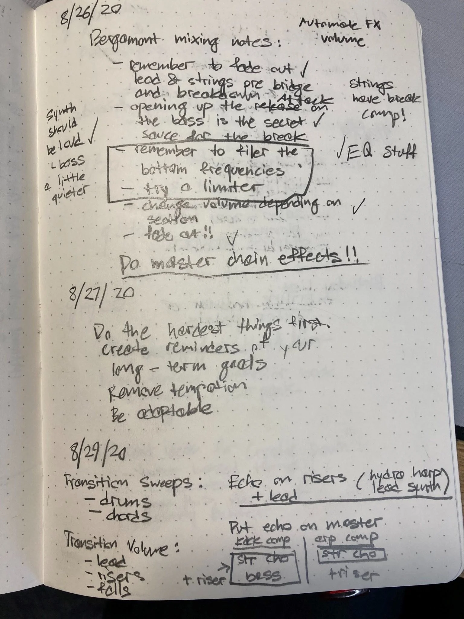 These are the mixing notes from my song “Bergamont”. I think I have come a long way in my production since then, but taking notes on the changes I wanted to make was particularly helpful. I think this was probably the most thorough I have taken the mixing stage in my music.