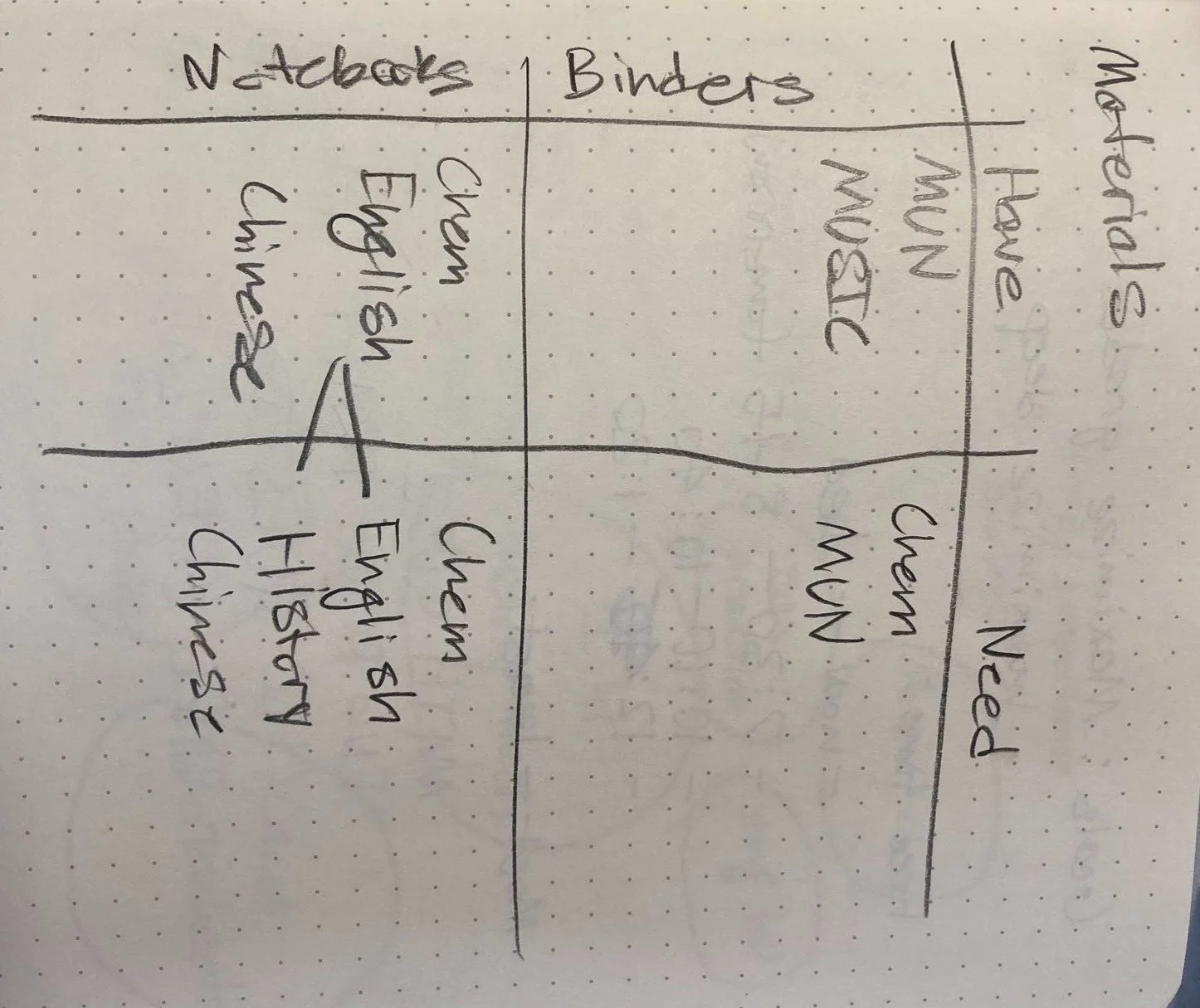 A graph of notebooks and binders I have vs. need. Useful to keep track of materials.